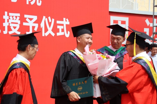党委常委、副校长于军和院领导来到仪式现场,为毕业生颁发学位证,毕业纪念品并合影留念。毕业生依次登台领取学位证。