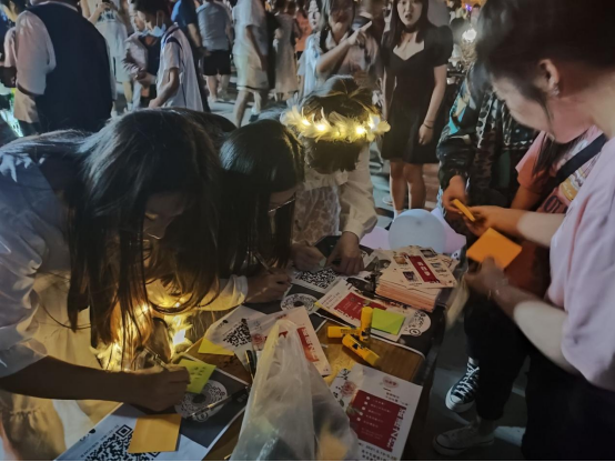 “——来呀来呀?——来干嘛呀?——来把梦想留在留言板上!”在东区操场晚会入口,化工院工作人员热情邀请前来观赏晚会的师生,鼓励并引导师生们用便利贴写下自己的梦想并粘贴在留言板上,便利贴上写满了梦想:“希望疫情早点结束”、“我一定会上岸”、“再等等,毕业我就来找你”……