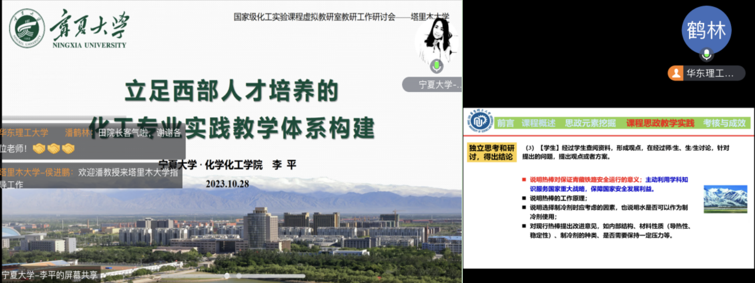 本次会议还邀请了煤化工虚拟教研室和化学工程与工艺专业虚拟教室参与指导工作,实现了多个虚拟教研室协同共享成果。与会专家围绕虚拟教研室、专业和课程等建设中给出各自高校的建设经验和成果,并以报告形式分享。其中华东理工大学潘鹤林教授作了题为《化工原理实验教学课程思政探索与实践,及华东理工大学实验室建设经验分享》的报告,从团队建设、课程建设、思政设计、思政案例、教学实践等多个方面详细介绍了化工原理实验课程的建设经验,并为行业特色课程思政教学范式提供了许多生动的典型案例。宁夏大学李平教授作了题为《立足西部人才培养的化工专业实践教学体系构建》的报告,提出要充分提炼课程中蕴含的文化基因以及价值理念,梳理课程内容与化工专业实践元素的结合方式,倾听学生心声,善于运用学生易于接受的教学方法开展实践性教学的重要性,为学生营造潜移默化的教学环境,做到“润物细无声”。大连理工大学潘艳秋教授作了题为《基于一流课程及学科竞赛,建设跨区域化工原理虚拟教研室》的报告,详细介绍了大连理工大学化工学院化学工程与工艺专业将一流课程及学科竞赛和虚拟教研室建设工作紧密结合的工作经验,强调了虚拟教研室建设在培养任课教师实验教学能力建设方面的重要作用。