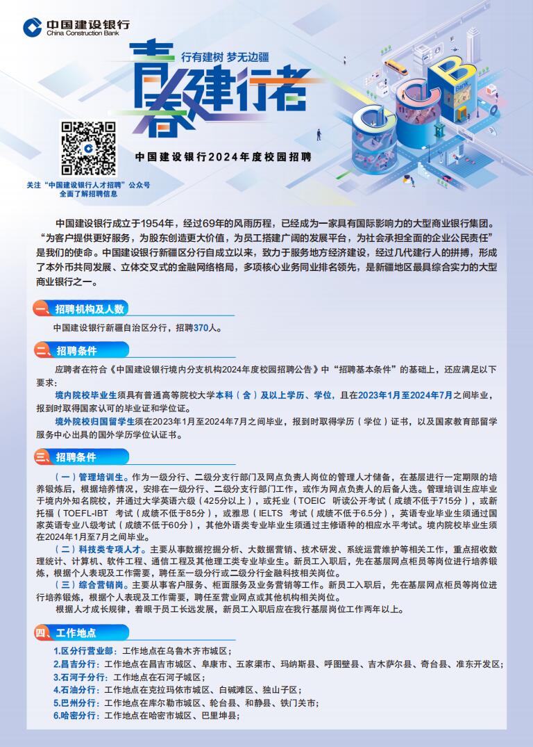 中国建设银行新疆维吾尔自治区分行2024年度校园招聘公告