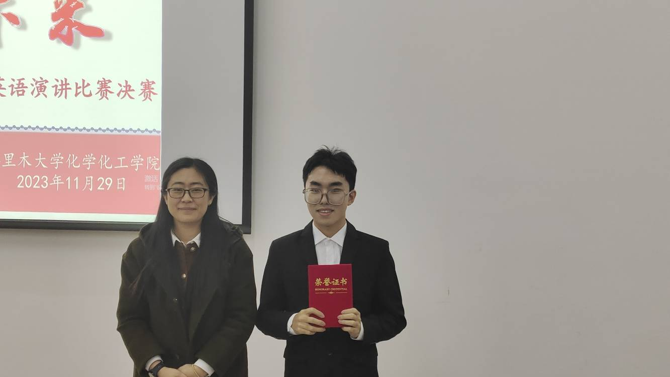 一等奖获得者应用化学2023级1班臧子豪激动地说;“非常荣幸获得这个奖项,作为一名胡杨学子,我深知自己的努力还不够,在今后我要践行好胡杨精神和兵团精神,认真学习知识,不断提高自己的素养,争做新时代胡杨青年,为南疆的发展贡献自己的青春力量”