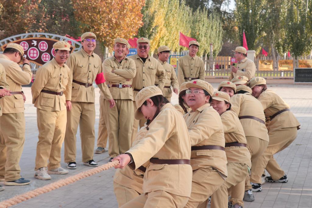“团结就是力量,团结就是力量,团结就是力量,这力量是铁,这力量是钢,比铁还硬比钢还强……”,在老一营红色教育基地,大家换上统一军装,化身“军垦战士”,昂首挺胸,严格按照教官的口令进行队列训练,共同完成了垦荒劳动、唱红歌、滚铁环、拔河、参观红色教育展馆、重温入党誓词等系列教育活动。