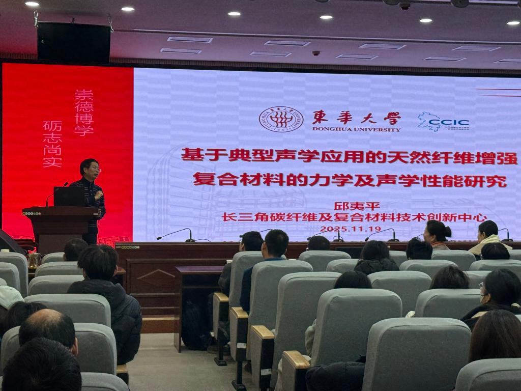 随后,东华大学特聘教授、原纺织学院院长、校党委委员、博士生导师邱夷平教授做了题为“基于典型声学应用的天然纤维增强复合材料的力学及声学性能研究”的学术报告。邱教授结合自身在纤维材料领域的深厚积累,聚焦麻纤维增强复合材料在乐器制造中的创新应用,指出该类材料替代传统木材制作乐器的巨大潜力。报告中,邱教授重点分享了团队自主设计的复合材料小样声学测试装置与大鼓测试方法,以及通过优化实验参数完善测试体系的研究过程,其研发的可拆卸式复合材料大鼓样品经声学评价表现优异,为绿色复合材料在乐器领域的应用提供了重要技术支撑。